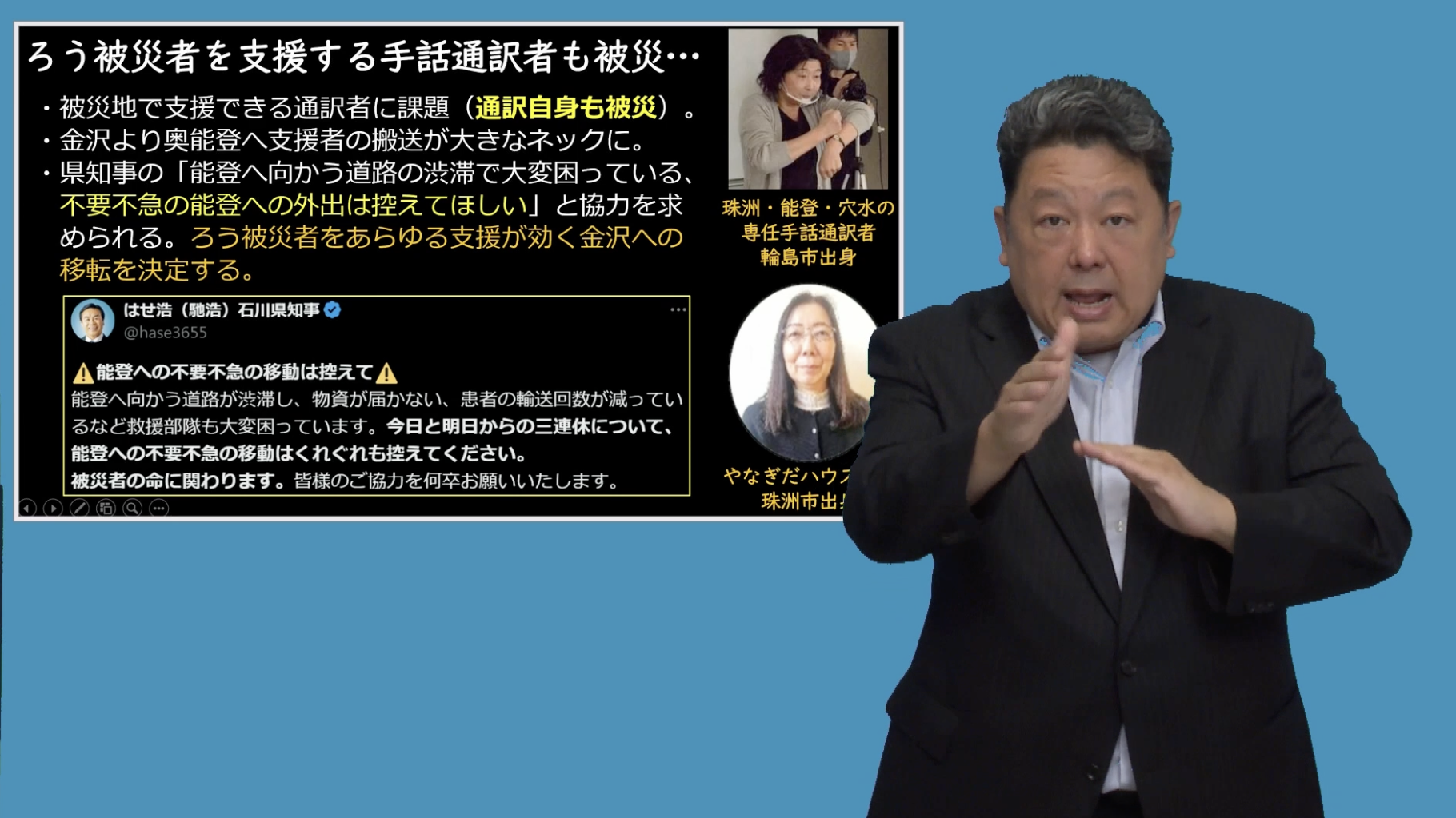 地震発生直後、センターは災害対策本部を設置し、3〜4時間後には委員が集合します。ろう者の安否確認を始め、手話による動画配信で能登在住のろう者へ情報を届けました。特に被害が大きかった能登就労支援事業所「やなぎだハウス」では約600万円の修復費が必要となりましたが、全国からの募金で再建の目途が立ちました。