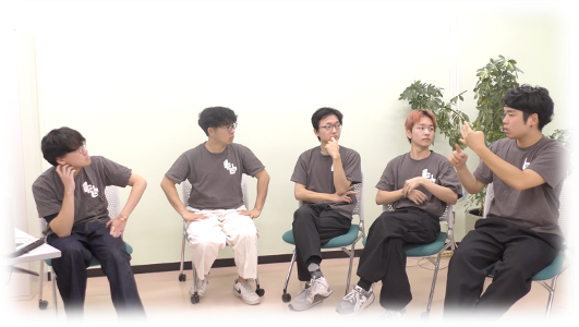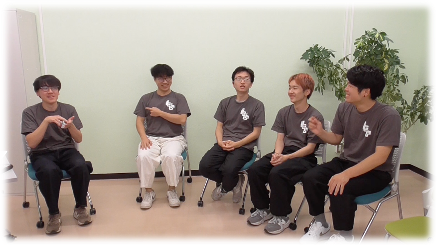今回は、第44回全国ろう学生の集いの実行委員会として活躍された筑波技術大学産業技術学部の学生4名、麻生直秀さん(2年)、川島琉武さん(3年)、久保雅翔さん(3年)、山地輝さん(3年)に、実行委員長を務めた藤井太陽を交えて、その経験と「ろうコミュニティ」への想いを伺いました。